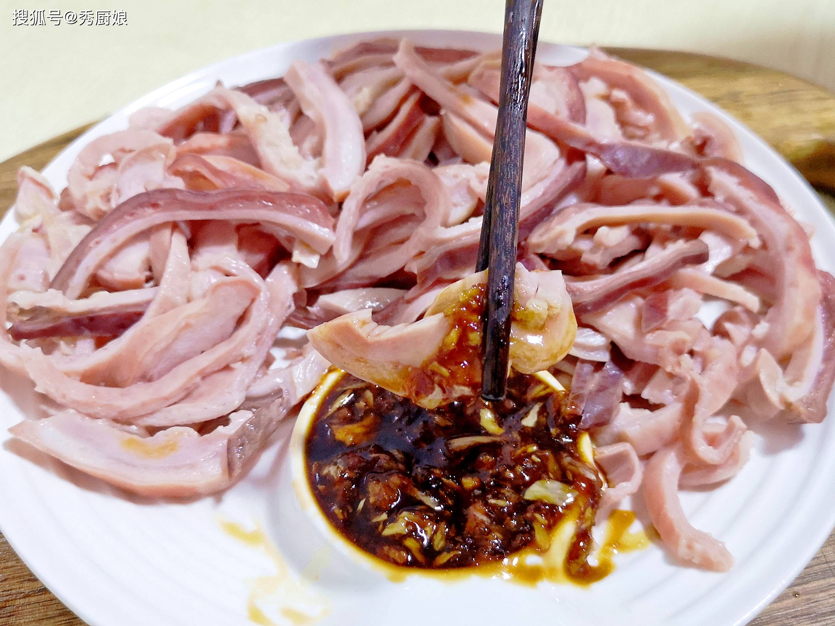 ④ 取出晾凉,切细丝,蘸蒜泥酱油汁(蒜末+生抽+少许香油)食用。