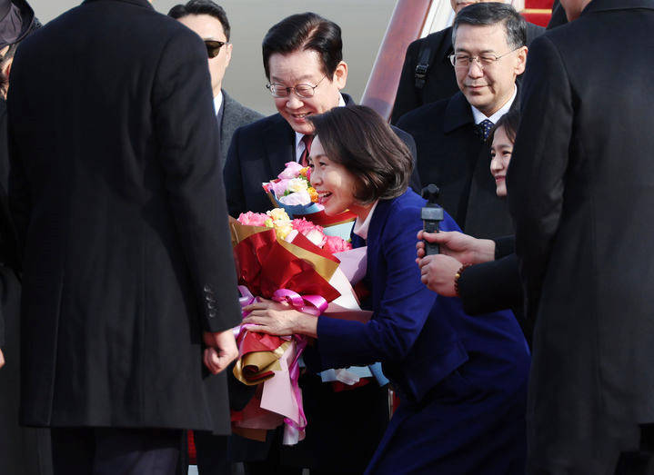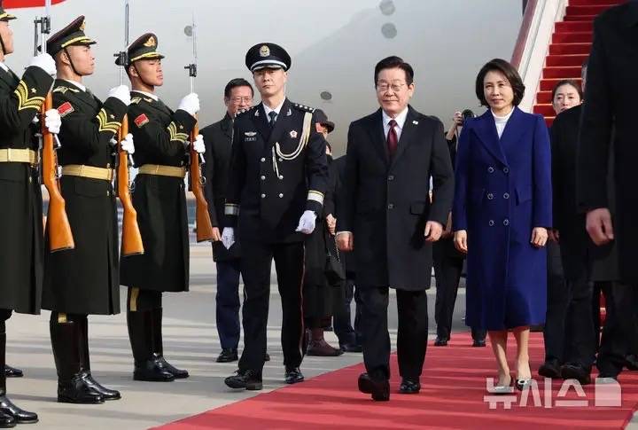 在公开场合,金惠景与李在明的互动总是温情脉脉。抵达北京时,她挽着丈夫的胳膊稳步前行,齐耳短发整齐利落,笑容温婉从容,蓝色大衣的垂坠感与她的仪态相得益彰,将“贤淑大气”的第一夫人形象诠释得恰到好处。