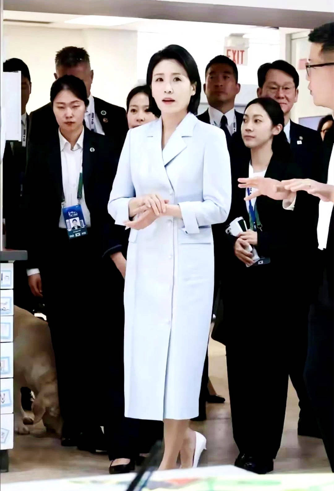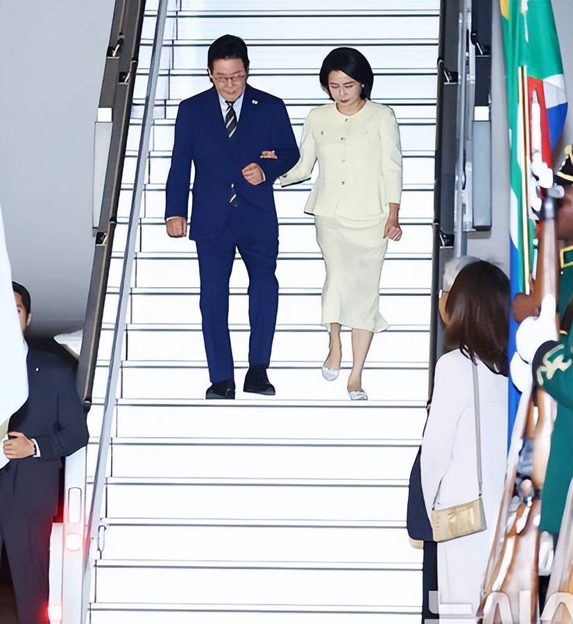 韩国总统专机降落在南非空军基地,金惠景身着米白色套裙迈出舱门的瞬间,全球镜头皆为其驻足。17 级舷梯,28 秒的行走,米白外套三次被风扬起,恰好露出同色短裙,既显腿长优势,又不失端庄。