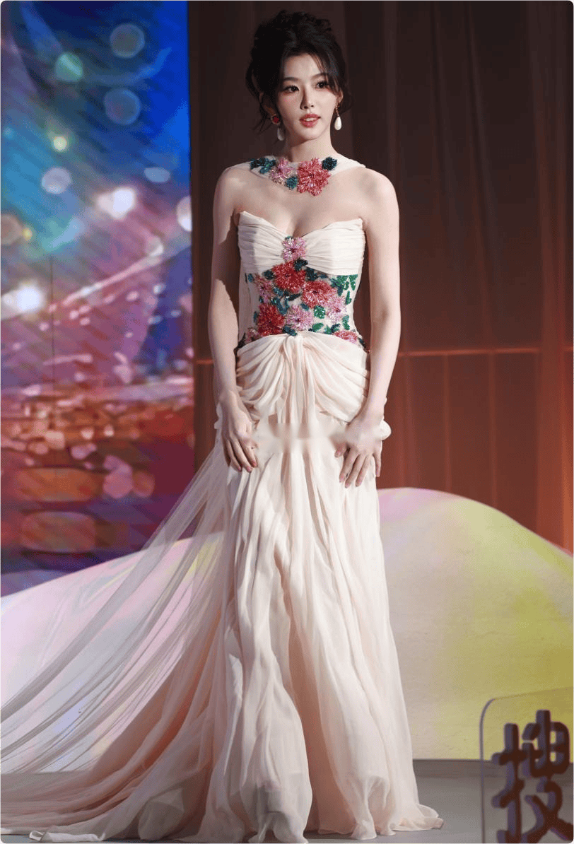先说这裙子的剪裁——抹胸设计把她的肩颈线条露得那叫一个绝!锁骨窝里能养金鱼不说,直角肩比健身房教练的还标准。腰身收得刚刚好,不是那种勒到喘不过气的紧绷感,而是自然流畅地勾勒出曲线,走起路来裙摆一荡一荡的,像朵盛放的玫瑰在随风摇曳。最绝的是裙摆长度,拖地但不冗杂,每一步都踩出“姐就是女王”的节奏,连旁边男明星的西装裤都显得黯淡无光!