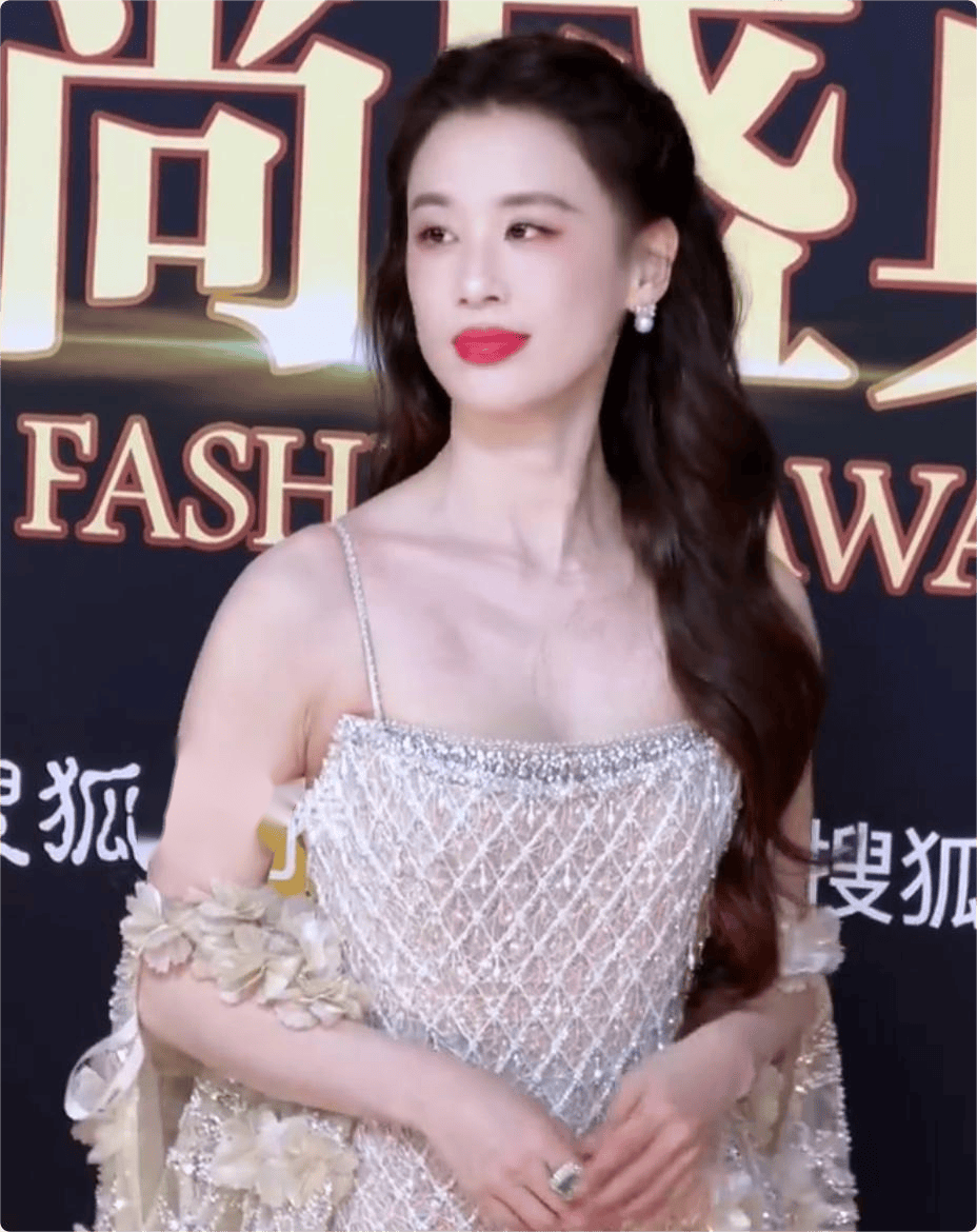再说说这颜色!玫瑰红可不是谁都能驾驭的,穿不好容易显俗气,但王星辰穿起来却像量身定制。她皮肤本来就白,这颜色一衬,整个人都在发光,连耳环上的钻石都成了陪衬。最妙的是她没选那种刺眼的大红色,而是带点灰调的玫瑰红,既保留了红色的热烈,又多了几分高级感,像刚摘下来的新鲜玫瑰,还带着露水的那种娇艳。